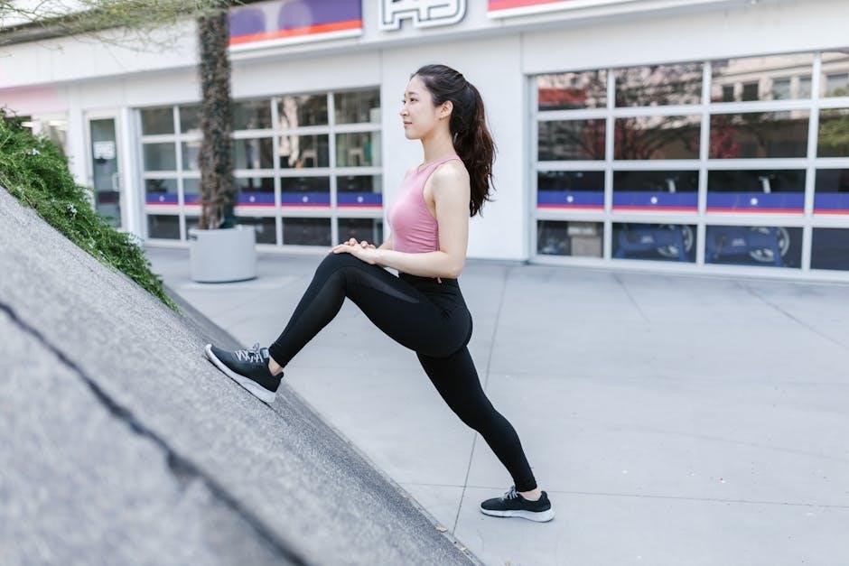 Cool-down stretches aid recovery and flexibility. PDF resources often include safety checklists and modification options.